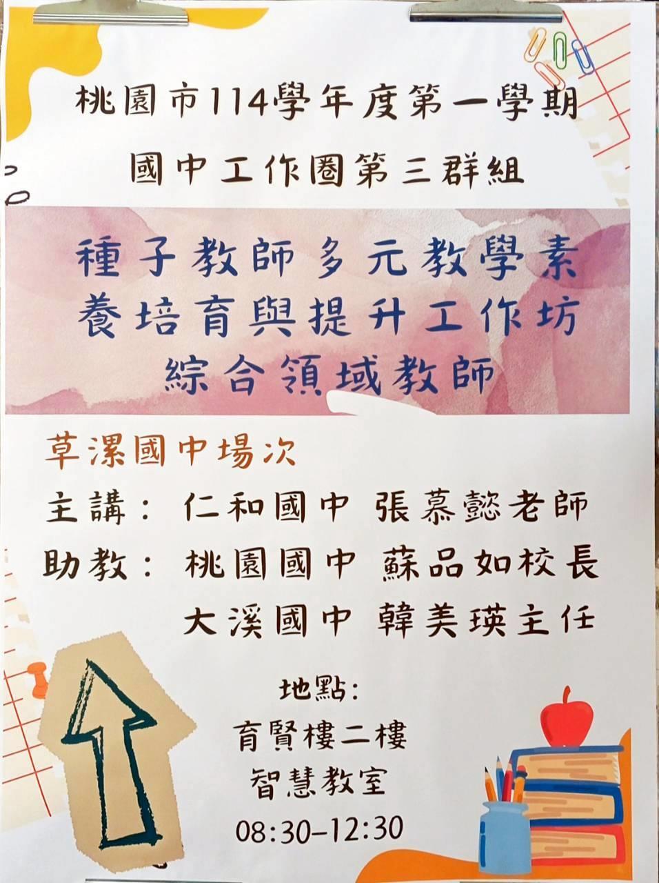 - 活動日期:114學年度第一學期國中工作圈第三群組綜合活動領域種子教師 多元教學素養培育與提升工作坊暨分區到校
