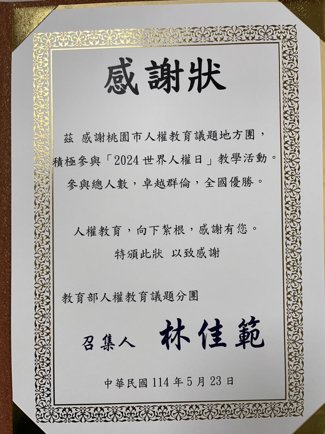 恭喜本市人權教育議題分團榮獲『2024世界人權日』教學活動全國優勝!