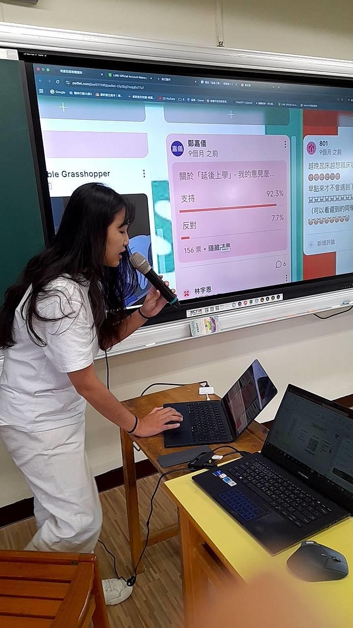 數位探究:草漯國中的老師透過Padlet,帶領學生進行社會議題,如是否要延後上學,學生將抽象知識轉化為具體公正共政策參與。